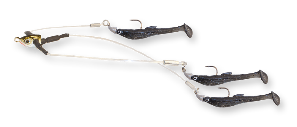 The Jerky J School rig allows fisherman to catch more bass. When bass school offshore, they often form in groups of hundreds of fish. Being the opportunistic- predators they are, bass will attack schools of minnows and the Jerky J School rig looks just like a school of minnows. Cast the Jerky J School rig, count it down to the correct depth and hang on! During testing it was very common to catch multiple bass on one cast. Superior all-metal tin construction with stainless steel wire and premium swivel and snaps.