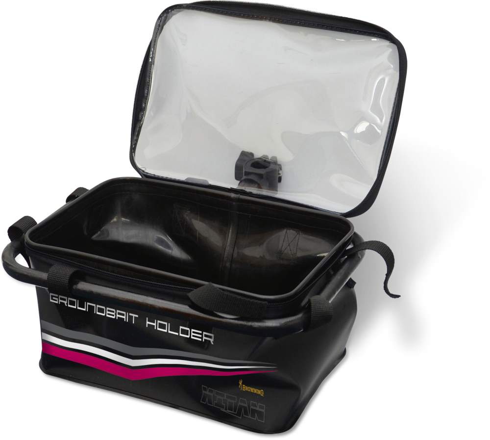 Square groundbait bowl with holder for attachment to a seat box or platform. Easy to clean thanks to the waterproof and wipe-clean material.