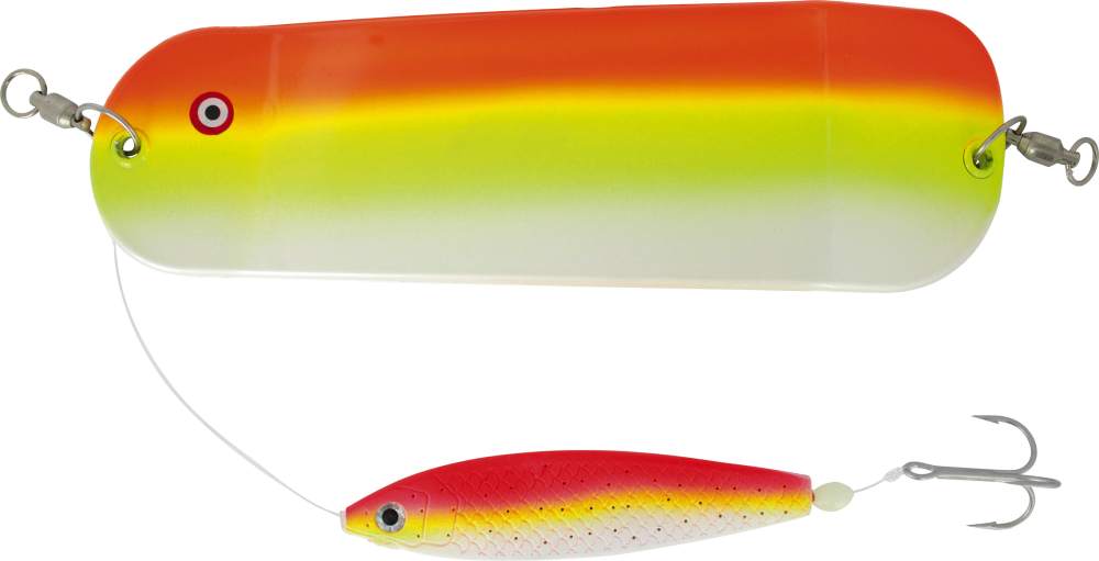 A long held secret of the professionals – flashers and lures in a similar colour! We have followed this approach closely with our compact flasher range. Ready-rigged with 0.60 mm monofilament and VMC permasteel hooks. Set contains a spare soft lure fish in case the original is bitten off after a few successful trips.