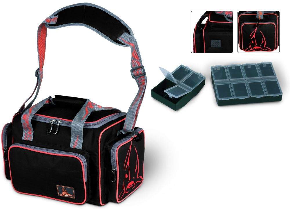 The Cube Bag is the little brother of the Gigantica Bag, but no less strong. This bag has metal fittings throughout and the base incorporates a waterproof floor. The Cube Bag is ideal for terminal tackle, clothing and accessories as well as scales and baits. For added storage space we’ve added two side pockets and an extra front pocket. The Cube Bag is the ideal travel companion for both short and long sessions and also looks pretty cool! • 2 free terminal tackle boxes