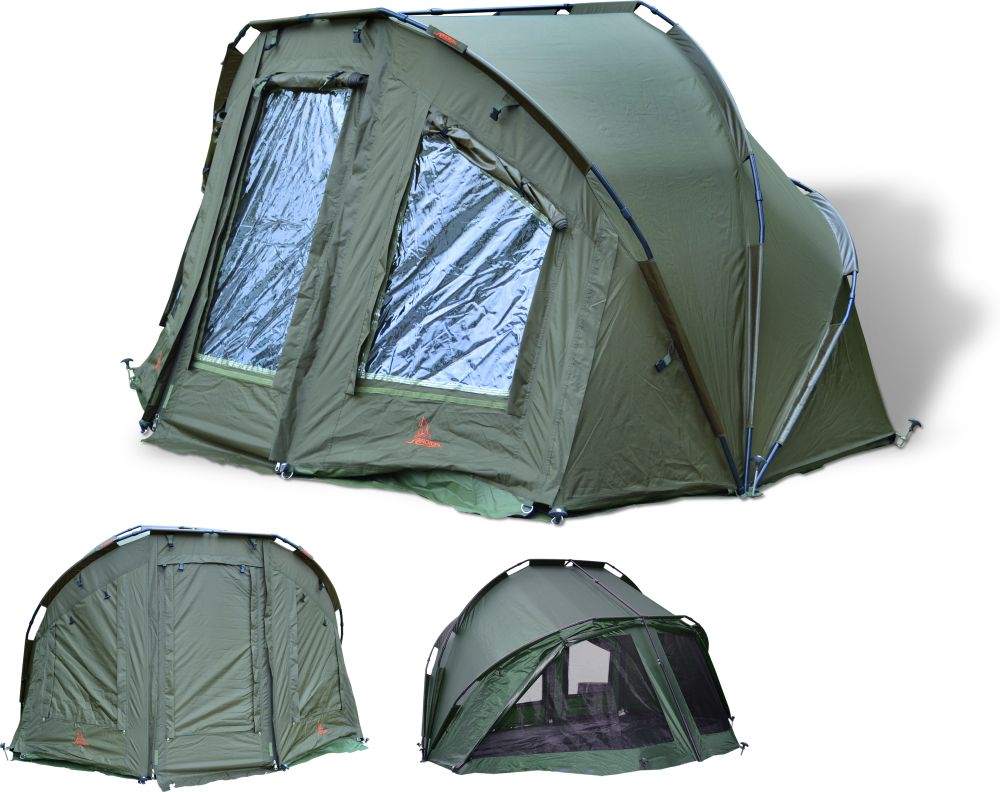 A tent that extends into a bivvy in seconds. The highly robust material is completely waterproof and windproof. The spacious interior provides space for up to two anglers. The bivvy is equipped with thick zip fasteners, robust tent peg eyelets and strong tent poles. To the front are two windows with mosquito nets and transparent film. The doors can be opened from both sides, with mosquito protection and windows. At the rear of the tent is a large window for optimal ventilation in summer. Supplied with a groundsheet and tent pegs as well as a large bag.